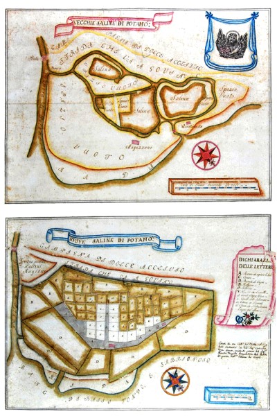 Δύο επιπεδογραφίες 18ου -19ου αι. που δείχνουν και τις παλιές και τις νέες αλυκές του Ποταμού