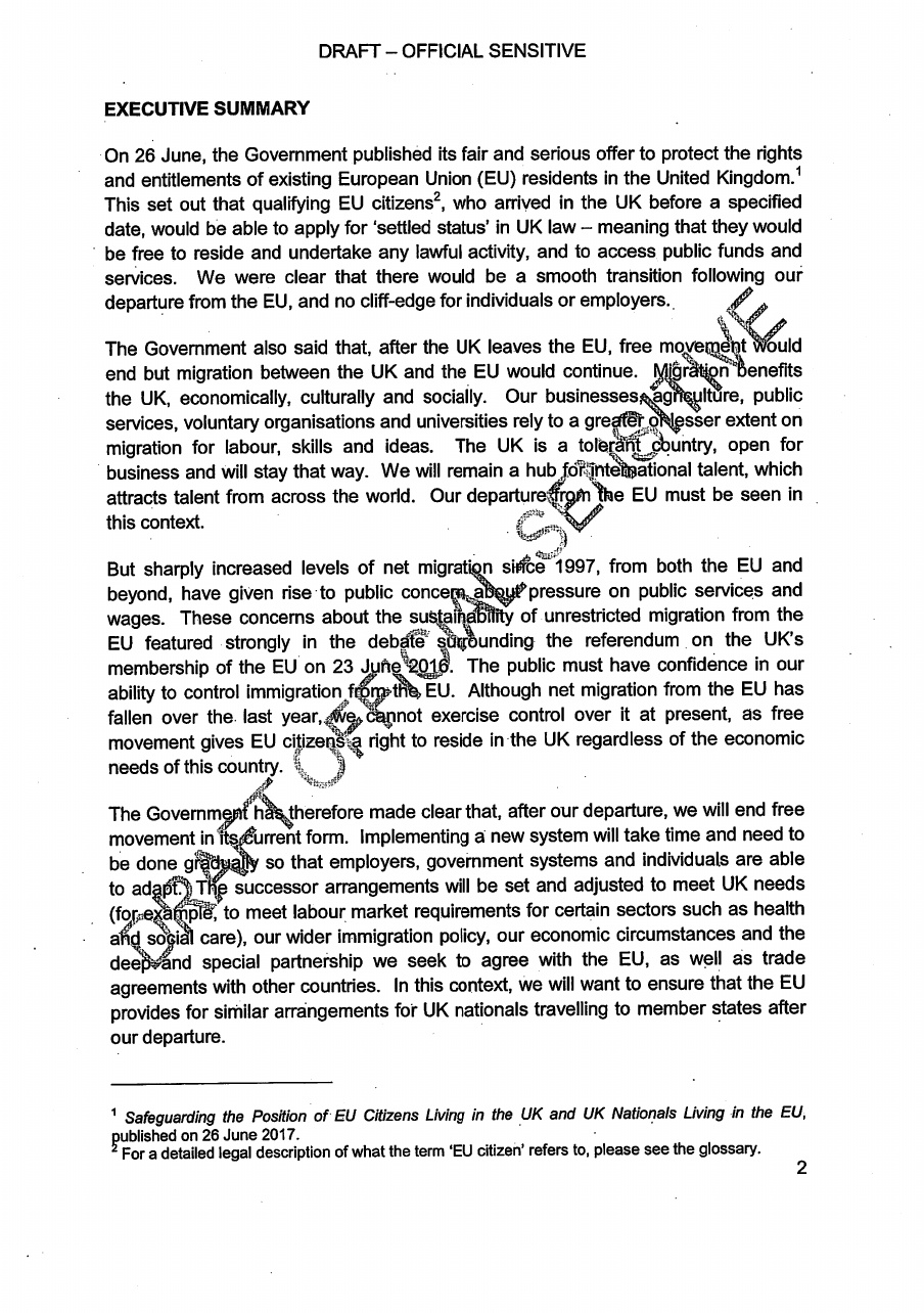 Στο έγγραφο περιγράφεται η εισαγωγή, σε φάσεις, ενός νέου μεταναστευτικού συστήματος, που τερματίζει το δικαίωμα εγκατάστασης στη Βρετανία για τους περισσότερους Ευρωπαίους μετανάστες, ενώ ταυτόχρονα επιβάλλονται σκληρότεροι, νέοι περιορισμοί στο δικαίωμά τους να φέρνουν στη χώρα μέλη της οικογένειάς τους.